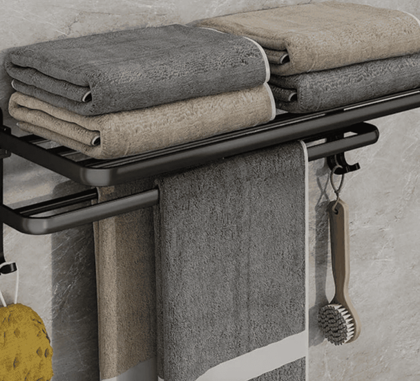 Four different yet equally practical bathroom shelf ideas: warm natural wood, an elegant gold-and-white spa vibe, and matte-black pieces with an industrial touch—all combine a shelf with a towel rail and hooks so everything’s one grab away. Over-toilet units reclaim “lost” wall area, while rimmed trays and slatted tops keep towels and bottles neatly arranged. Pick your style and you’ve got a compact, good-looking setup.