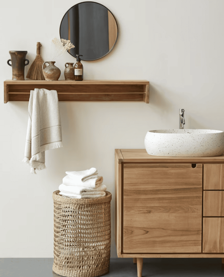 Warm-toned floating corner shelves turn “dead” corners into tidy, eye-catching storage. Hidden brackets keep them light; natural wood softens marble or subway-tile backdrops. Style with towels, amber bottles and trailing greens for a mini-spa vibe in the smallest bath. In splash zones, choose properly sealed (lacquered/oiled) finishes so wood stays beautiful. Cleaning is also easier if you choose floating shelves instead of ones that stand on the floor.
